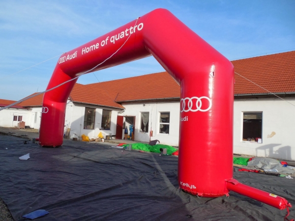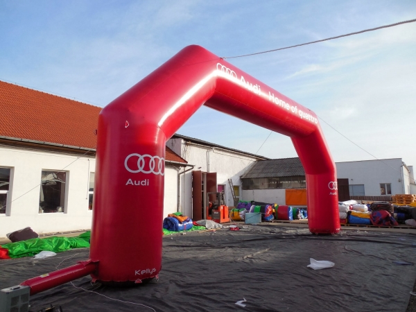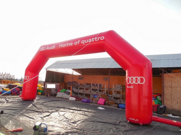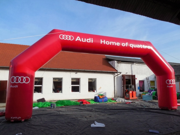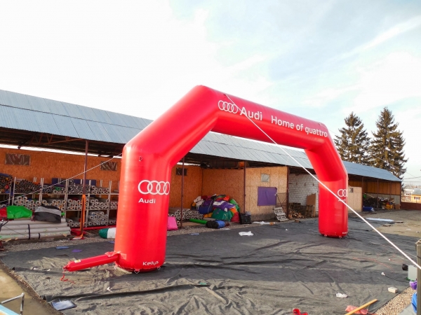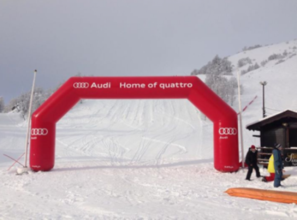 Kunde: Audi. 13(10)(m)L x6(4,5)(m)H. Innvendig bredde er 10 m, tilsvarende minimumskrav fra FIS. Reklameprodukt for å synliggjøre arrangør og/eller sponsor.