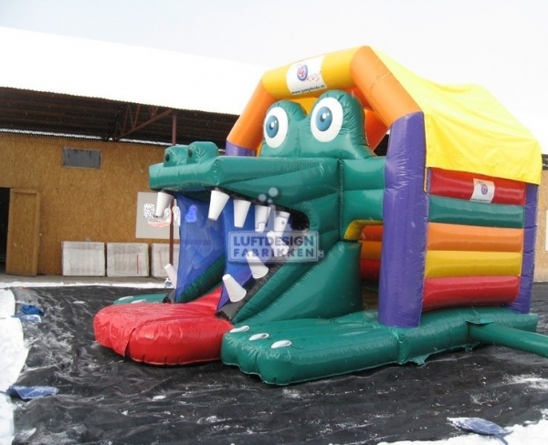 6,6 (m)B x 4,2 (m)L x 3,9 (m)H. Krokodillen er et fascinerende dyr for de minste. Denne hoppeslottsklien har en stor munn som barna sklier ut igjennom når de bruker sklien, en meget populær detalj.