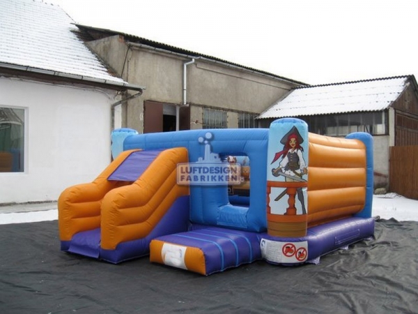 5,4 (m)B x 4,6 (m)L x 2,5 (m)H.Denne hoppeslottsklien er laget for lokaler med lav takhøyde, og er super populær blant små sjørøvere.
