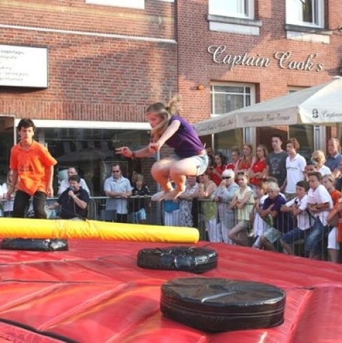 8(m)L x 8(m)B x 2,4(m)H Dette er en av de mest imponerende oppblåsbare aktiviteter utviklet og produsert av vår europeiske produsent. Passer for alle aldre og ferdigheter, deltagerne står på hver sin oppblåsbare pute mens pendelen svinger, deltagerne må hoppe for å unngå å bli truffet av pendelen samtidig som de må passe på å holde balanse for å bli den siste som står igjen! Pendelen kan stilles til ulike hastigheter for å variere vanskelighetsgraden. Last one standing er nøye designet, utviklet og produsert av på vår fabrikk. Aktiviteten kan brukes av opptil 8 deltagerne om gangen