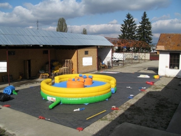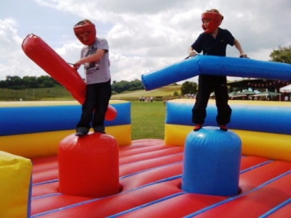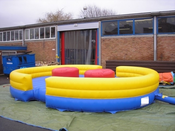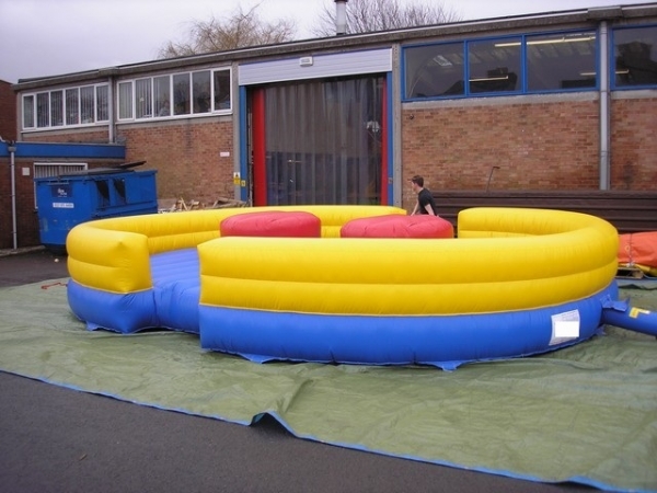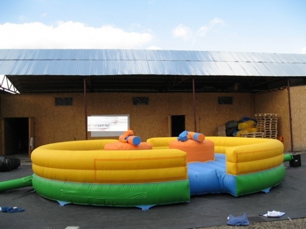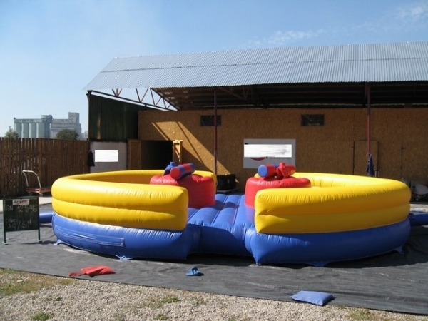 7(m)L x 5(m)B x 1(m)H Gladiator Duell er en glimrende mann mot mann eller kvinne lek. Deltagerne starter på hver sin opphøyde pute, utstyrt med skumgummi beskyttede gladiatorstang og hjelm. Her får man utfordret hverandre i en morsom fysisk gladiatorkamp med røtter tilbake til romertiden, i trygge omgivelser. Gladiatorkampen vinnes ved at den ene deltageren får den andre til å ramle ned fra sin pute mens den blir stående selv. Og selvsagt den som ramler, lander mykt og godt på en oppblåsbar mega pute;-)