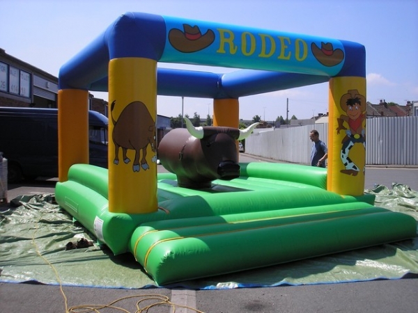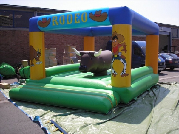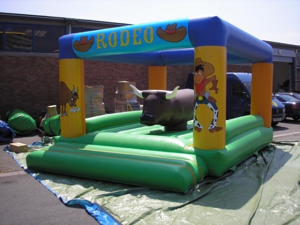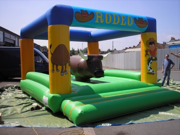 6(m)L x 4.5(m)B x 3.15(m)H. Oppblåsbar rodeo okse er en vinner på firmafest arrangementer og en suveren test av balanse er surfebrett simulatorer og rodeo okse simulator. Rodeo oksen levers med en oppblåsbar pute som deltagerne kan falle trygt ned på. Her gjelder det å klamre seg fast til okse så lenge du klare mens den beveger seg rundt og opp og ned.