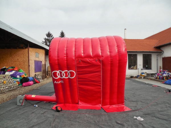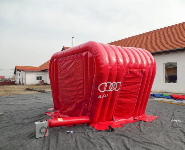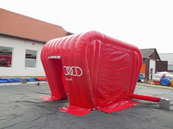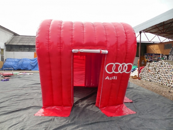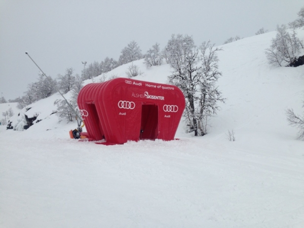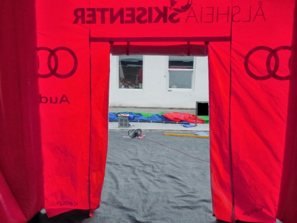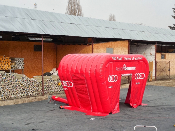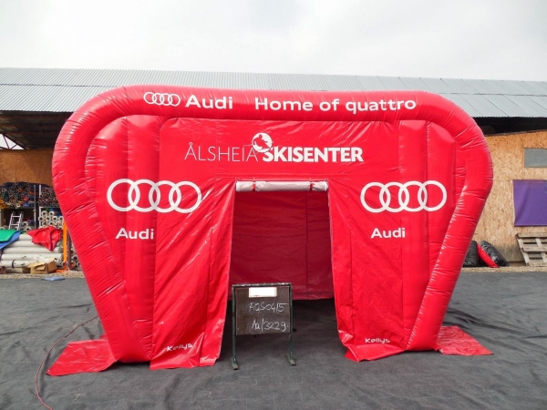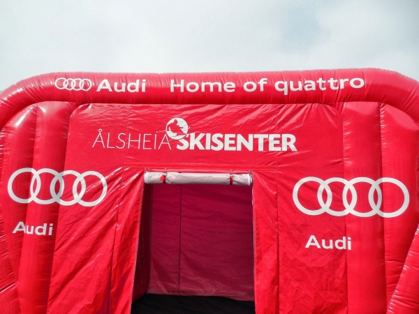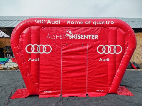 Kunde: Audi. 5(m)L x 3(m)D x3(m)H. Oppblåsbart starttelt med mulighet for sponsor profilering. 2 i 1 produkt. Bakveggen kan brukes som seremonivegg.