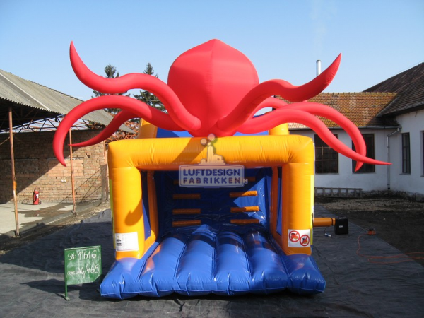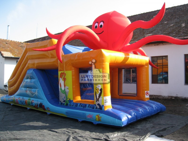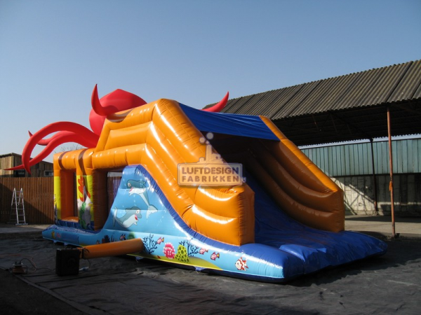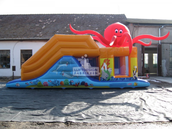 9.7(m)L x 3.2(m)D x 3.9(m)H. Fin hinderløype med blekkspruten i toppen som en lekker detalj. Hav, dyr og hinderløype er en sikker vinnerkombinasjon blant barna.