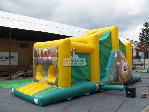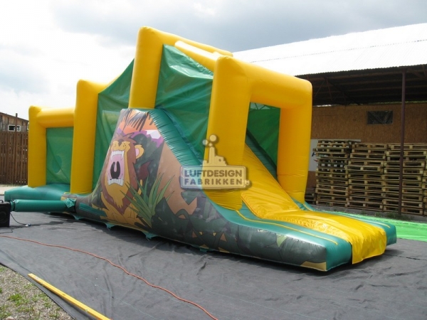 10.4(m)L x 2.7(m)D x 3.9(m)H. Vår bestselgende hinderløype. Udødelig tema, en kvalitetshinderløype varer lenger enn en trend, Dyr og jungel har alltid vært populært blant barn, og vil trolig alltid være det. Hinderløype kan aktivere veldig mange barn om gangen, en tur igjennom hinderløypen går fort, derfor går også køen fort.