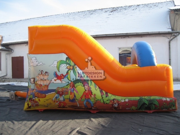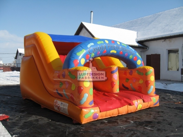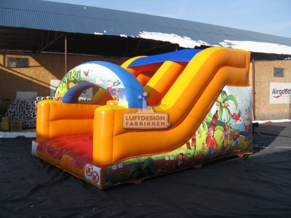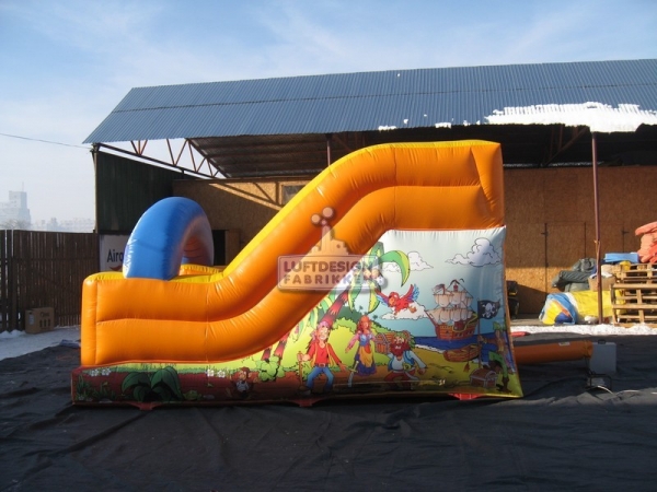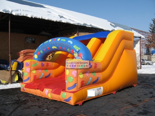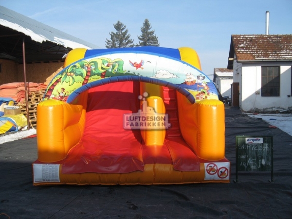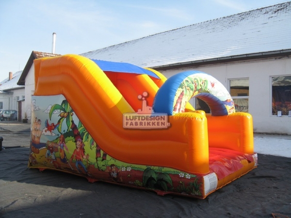 5(m)L x 3.5(m)D x 2.9(m)H. Ypperlig sklie for lokaler med lav takhøyde. Denne oppblåsbare sklien er laget for å passe inn på lekeland, bilbutikker, senter og lignende med lav takhøyde. Den er lav og smal slik at den er plasseffektiv, men fortsatt ganske lang for å gi en god leke opplevelse.