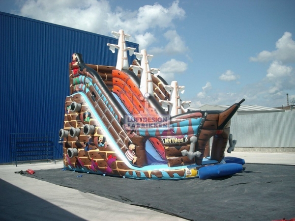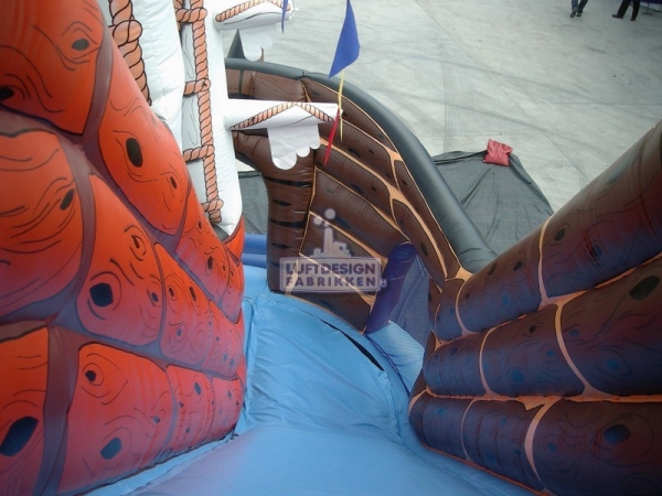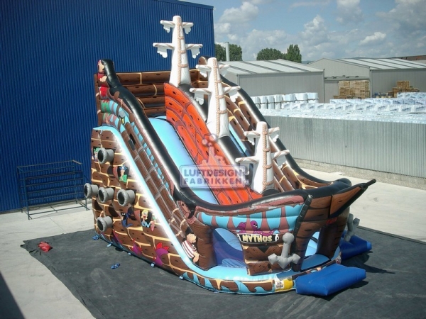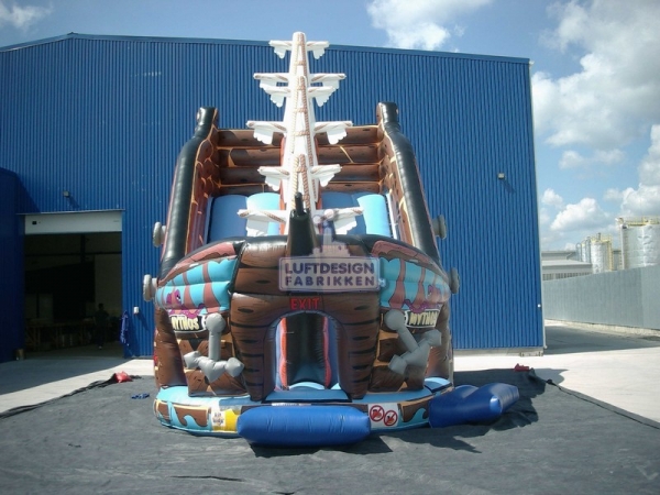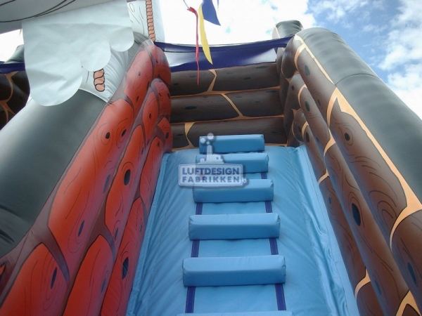 10.8(m)L x 6.2(m)D x 5.7(m)H . Verden er full av små sjørøvere, dette er alle små sjørøveres favoritt sklie. I oppblåsbare sklier er reglene at kun ett barn skal skli om gangen, men det går jo fort så man kan godt ha 50 barn om gangen, køen tar uansett ikke så lang tid i en sklie.